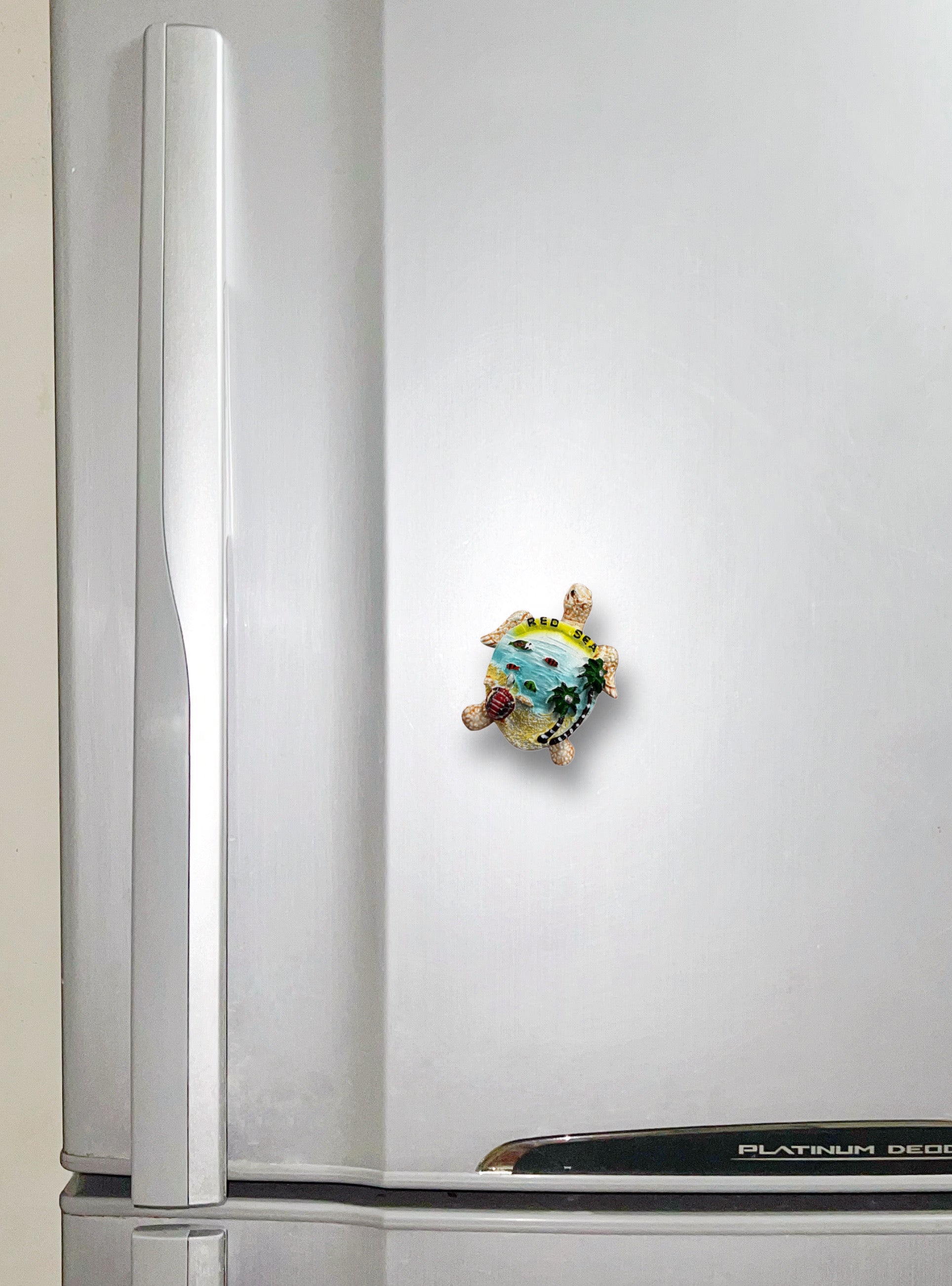 Introducing our captivating "Red Sea Turtle" fridge magnet! This charming magnet features a delightful turtle shape adorned with intricate sea creatures, creating a whimsical underwater scene. The turtle's shell proudly displays the text "RED SEA," adding a touch of uniqueness to this eye-catching magnet. Made with high-quality materials, this magnet is not only a functional accessory for your fridge but also a beautiful piece of decor that will brighten up any space. Add a splash of marine charm to your kitchen or office with our "Red Sea Turtle" fridge magnet!