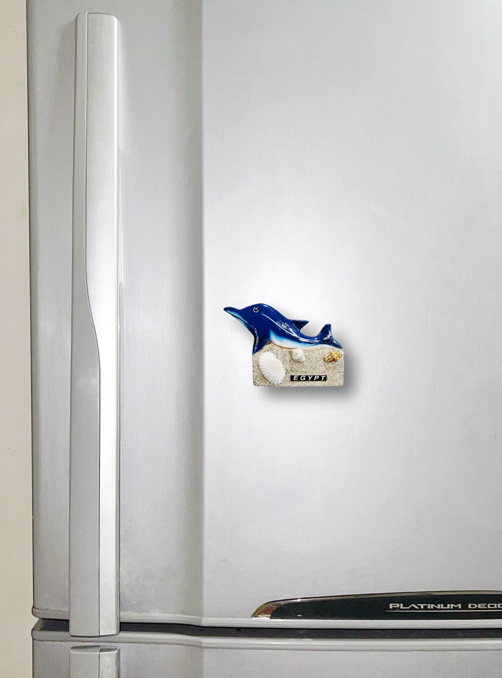 Add a splash of coastal charm to your home with our Playful Dolphin with Seashell Fridge Magnet.